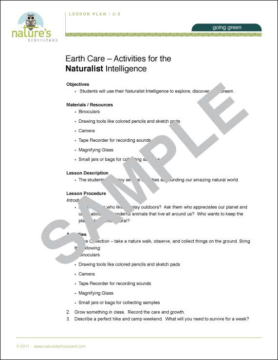 Children will love this lesson as they use their Naturalist Intelligence to explore, discover, and dream. The lesson concentrates on five fun activities including a nature walk where students collect items on the ground to discover and inspect.
