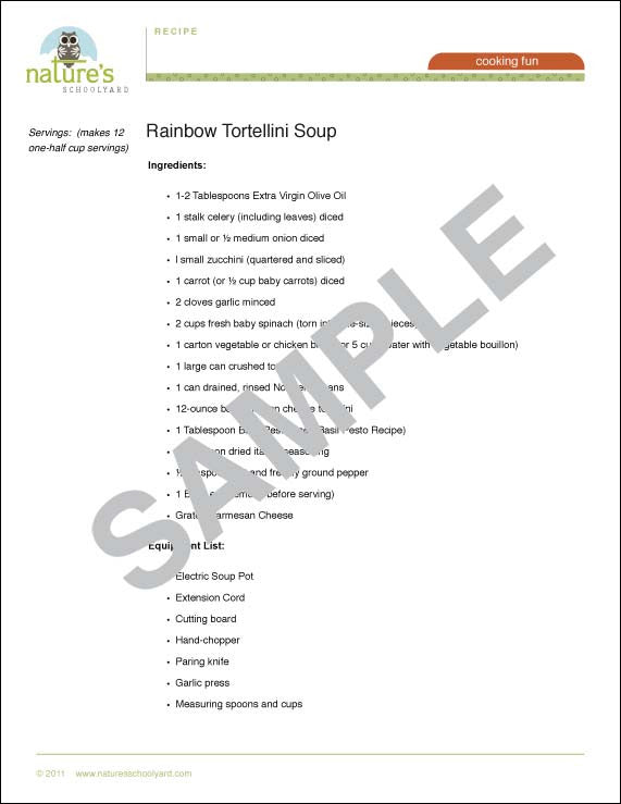 Rainbow Tortellini Soup is a great harvest celebration meal! Every stripe of My Pyramid is included in one tasty, super-healthy bowl of soup (Craig's favorite)! I have made this recipe with many classes in a one-hour time slot. This recipe is great paired with Easy Cheesy Garlic Bread—yummy! One pot will provide a small bowl to 20-25 students.