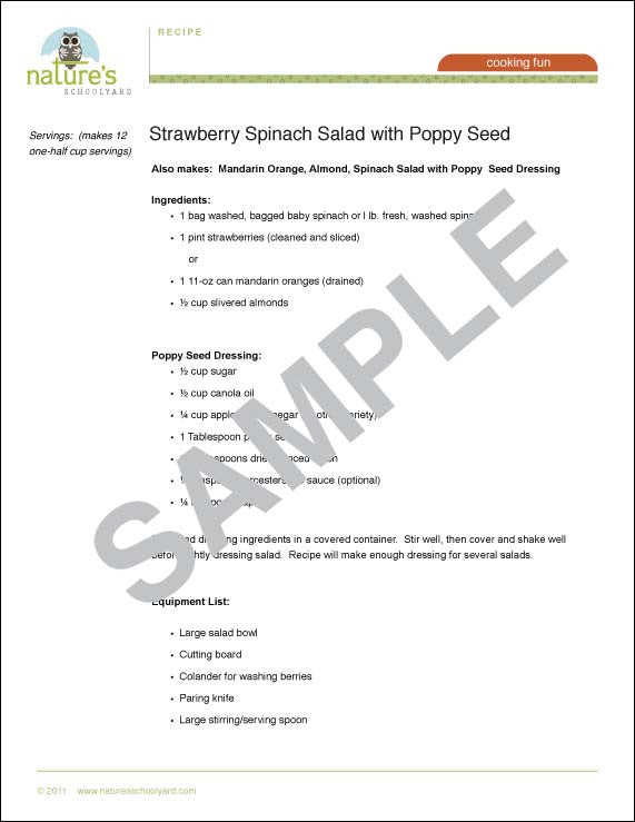 Strawberry Spinach Salad with Poppy Seed Dressing is a delicious way to introduce kids to spinach (one of our healthiest greens in the garden). This recipe can also be made with Mandarin Oranges and almonds when fresh strawberries are not available. This recipe will serve approximately 12-15 students.