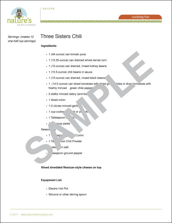 Three Sisters Chili is an excellent culminating recipe for Fall Harvest or anytime. The chili features the Three Sisters: Corn, Beans and Squash. This recipe is a great lesson for nutrition, because it features all of the stripes of My Pyramid. Serve with Cornbread for a Fall Harvest Dinner. One recipe will serve 20-25 students.